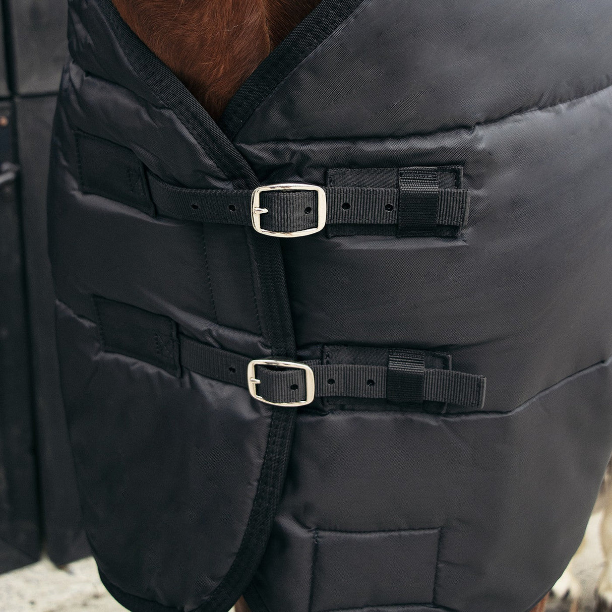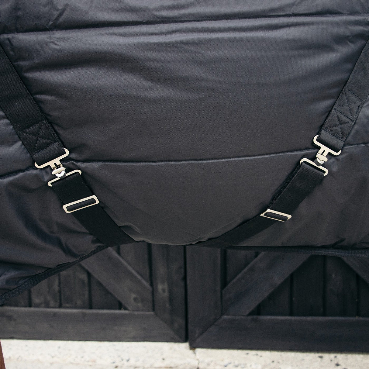 A durable 420 denier nylon outer shell with 300 g of high grade poly fill combine into warm and long-lasting stable blanket that comfortably fits every shape and size. The nylon inner lining helps reduce rubbing, keeping your horse comfortable throughout all kinds of movement. Two nylon front straps with buckles, cross-biased surcingles, and a back seam help keep the blanket in place, and back leg straps. Complete with reinforced stitching at all stress points.