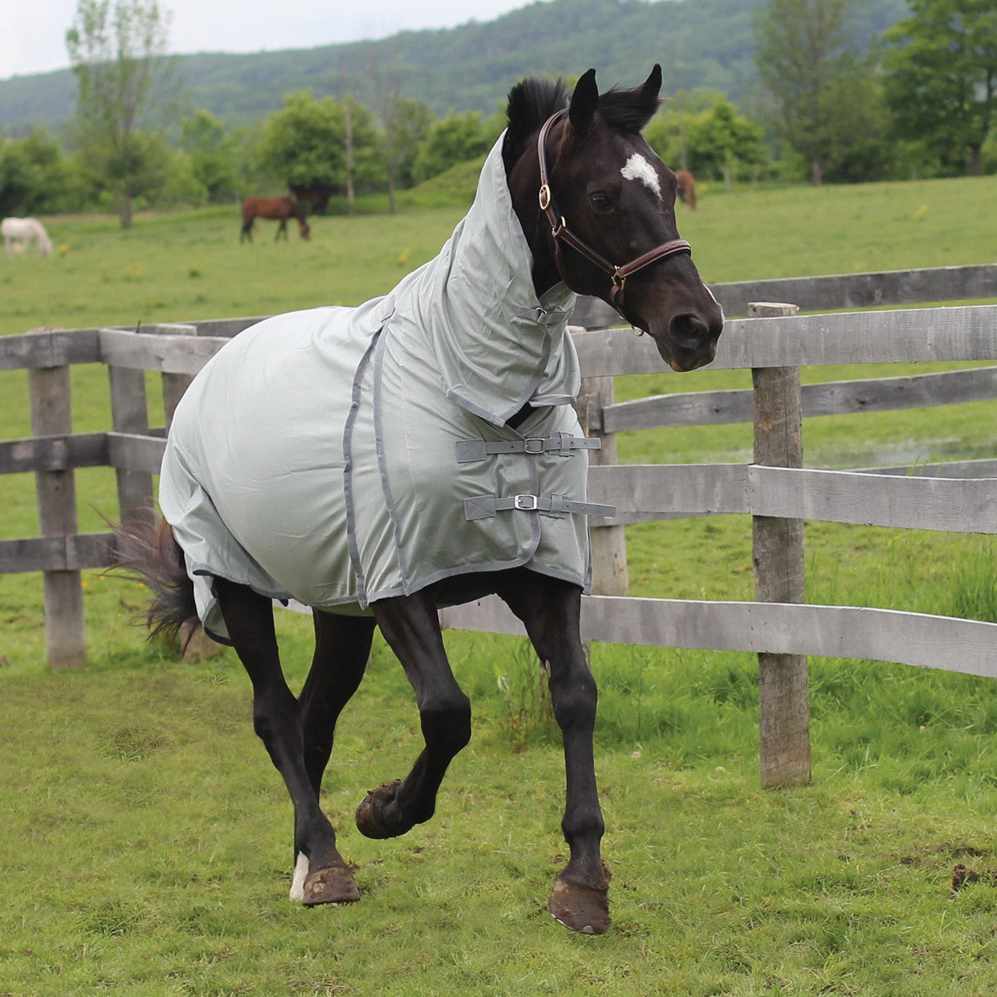 Full coverage fly sheet covers sensitive areas with a high neck extension and wide belly band. A deep shoulder gusset offers maximum freedom of movement while the lightweight deluxe mesh material offers maximum airflow. Double Velcro closures and a D-ring Velcro fastener under the throat offer a more secure fit. Complete with back leg straps.