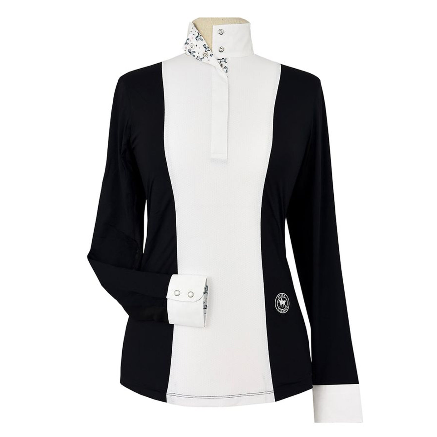 The Essex Luna II features a classic white front panel with a crisp white cotton collar. Cool, 4-way stretch performance fabric with under-sleeve mesh ventilation panels keeps you comfortable no matter the weather. Finished with a pullover snap front collar and contrasting fabric trim. The tapered fit tucks easily into breeches (and stays tucked!).