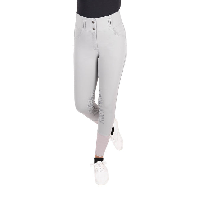 The Elation Platinum Nolita Breech offers exceptional comfort and style while schooling. Features a wide waistband, 2 snap Gutos closure and smaller belt loops. Complete with a euroseat seam, silicone knee patches for added grip in the saddle, a sock bottom for a smooth fit under tall boots or chaps, and a rhinestone trim on the back pockets.