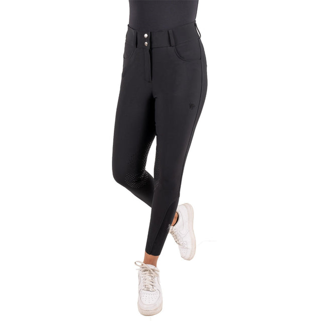 The Nikara Signature Breech is beautifully crafted from smoothing and compressive fabric for ultimate comfort and feel in the saddle. Features two front pockets, one back pocket, and a wide stretch waistband that contours lower in the front for added comfort. Complete with belt loops, silicone knee patches for added grip in the saddle, stretch tone on tone socks, and rhinestone accents for a sophisticated appearance.