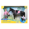 Whether riding in the show ring or for a round of practice, English rider Lauren and her beautiful dark, seal bay horse, Logan, are ready to leap into action! This horse and rider set includes a 6 in posable rider in pretty pink riding gear, a Freedom Series horse, a pink saddle pad to match the rider's outfit, an English saddle, and bridle.