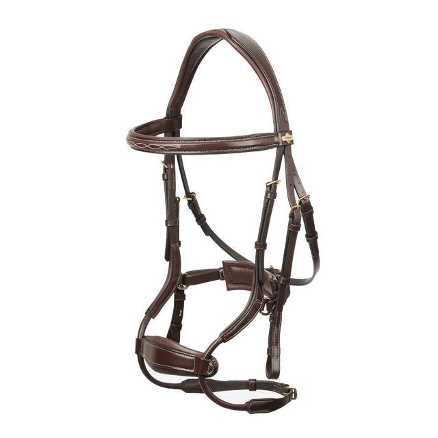 The LeMieux Kudos Clear Arc Bridle is crafted from European leather with fancy stitching along the noseband and browband for added style. The anatomically shaped and padded headpiece and browband offer additional comfort while the S-shaped noseband sites pressure around three areas of the nose, helping to prevent the horse from crossing its jaw. Complete with a crank style closure. Reins sold separately.