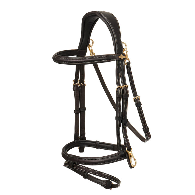 The LeMieux Kudos Work Bridle is stylish and practical with a removable flash on the raised, padded noseband. Made from beautifully oiled leather to avoid stiffness. Features clips on the cheek pieces to allow for easy changing of the bit along with a clipped throat latch that may be detached. The anatomically shaped headpiece offers padding with a cut around design to maximize comfort while reducing pressure at the poll. Complete with brass hardware. Reins sold separately.