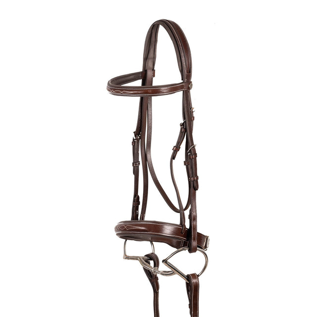Finely crafted in exceptional leather for the utmost in quality, Mondega’s Wide Noseband Hunter Bridle has exceptional attention to detail and precision stitching. The widened noseband of this bridle accommodates larger horses and allows for additional comfort. Great for both schooling or for in the show ring, the Mondega Wide Noseband Bridle provides detailed stitching and is sure to impress. Reins included.
