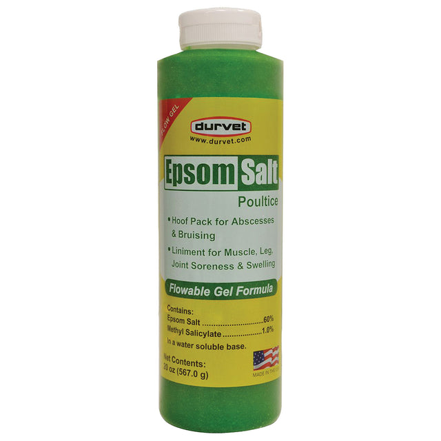 Durvet Epsom Salt Poultice is a topical gel for temporary relief of minor pains, bruises, and sprains associated with muscle and joint injuries. Effective as a drawing agent to address abscesses, infections and sole bruising. Helps reduce inflammation and soothes pain caused from bruises, sprains and insect bites. Green, minty-smelling Flowable Gel's convenient squeeze bottle allows direct, clean, one-hand application to affected areas without soaking.