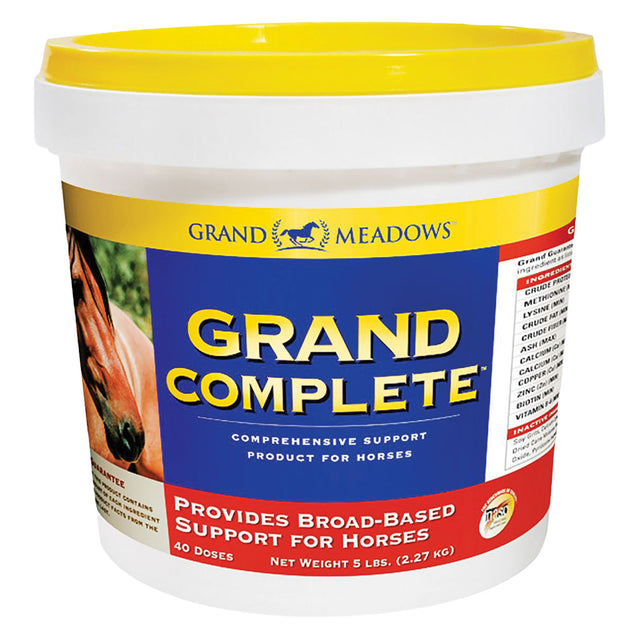 Grand Complete™ contains key ingredients from our most popular products: Grand Flex, Grand Hoof Pellets, Grand Coat, and Grand Vite. The unique, all-in-one formula helps to support and maintain the joints, hooves, coat, immune system, and digestive tract. Grand Complete™ simplifies your supplement program and helps reduce supplement costs.