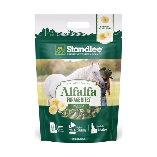 Standlee Alfalfa Forage Bites Banana flavored horse treats are made with premium alfalfa hay. Enhanced with banana flavoring and no grains or fillers added, Forage Bites are a treat that both animals and owners will love. These treats are highly palatable and low in starch and sugar. Great for horses, cattle, and large livestock and safe for overweight horses and performance horses. Made from high quality, sun-cured alfalfa on Standlee's farms in Idaho.