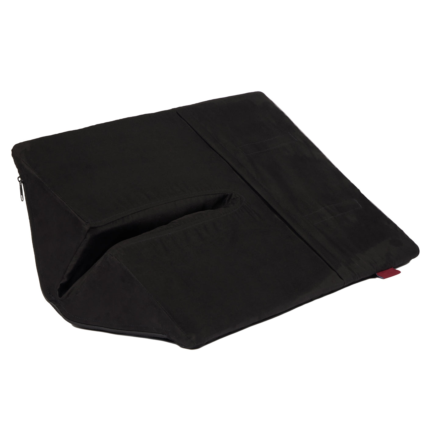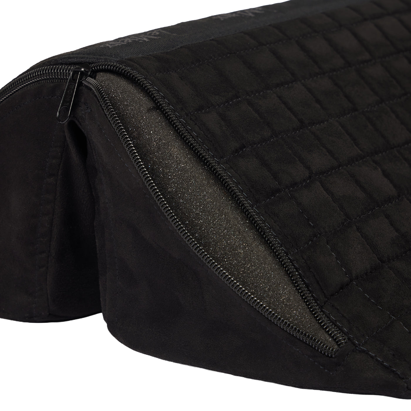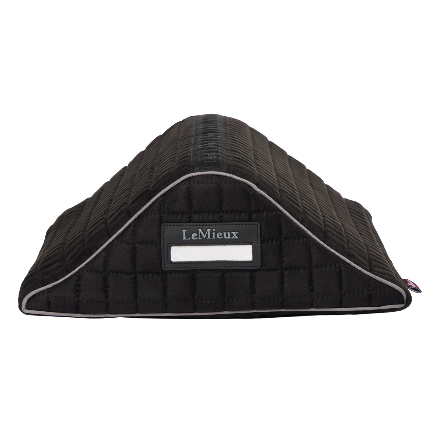 Offers protective cushioned support for your saddle during storage. Features a quilted suede design with contrast piping. Complete with an embossed leather branded name insert holder, and signature LeMieux red tab.