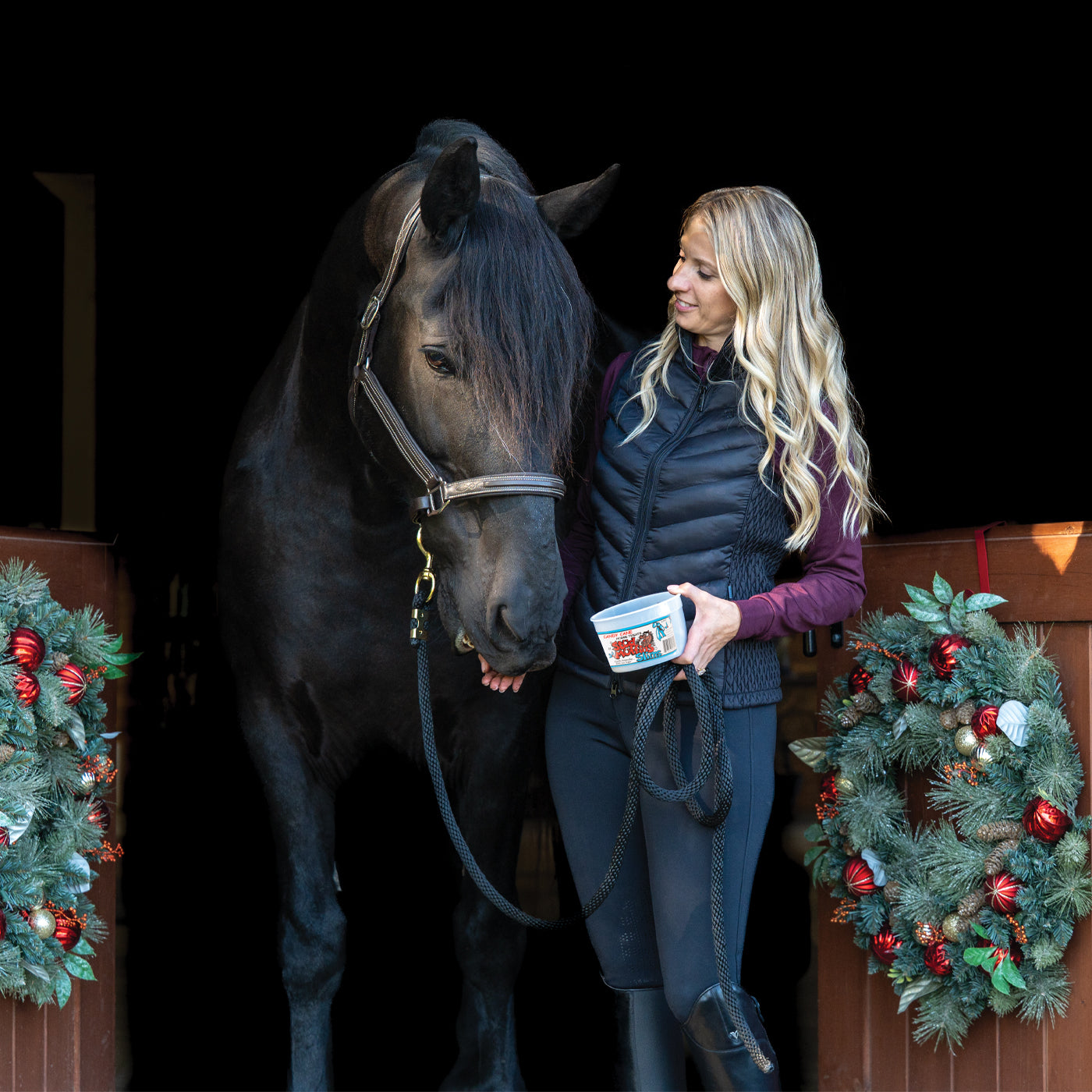 Stud Muffins are 100% hand-made horse treats that are crafted with care and devotion. Each treat contains grains such as wheat, oats, barley, and corn, and is fortified with flaxseed and other wholesome ingredients. Stud Muffins are as healthy as they are enjoyable! Features a slim construction, offering 50% less sugar than regular Stud Muffins. Packaged in a convenient and releasable tub with a candy cane flavor, perfect for the holidays.