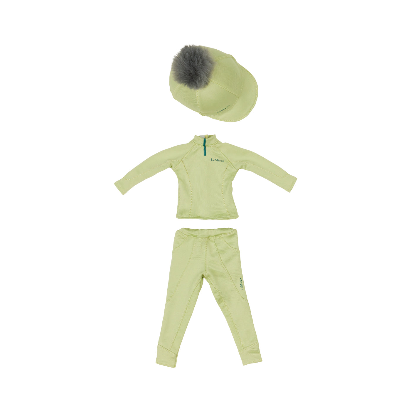 Toy rider-sized replicas of authentic LeMieux clothing for your favourite LeMieux Toy Rider dolls. Set includes matching breeches, a base layer and a helmet cap. Removable and adjustable clothing with hook and loop closures. Collect your own mix and match sets!