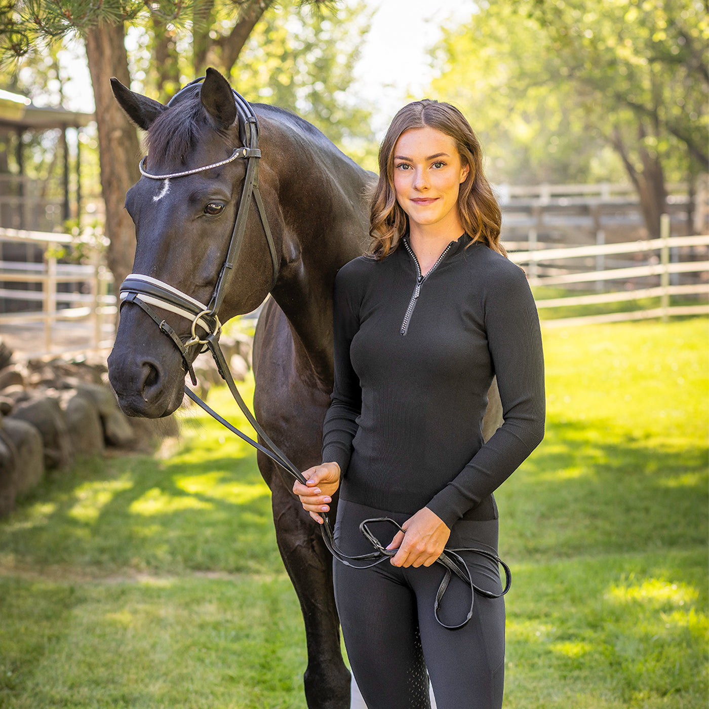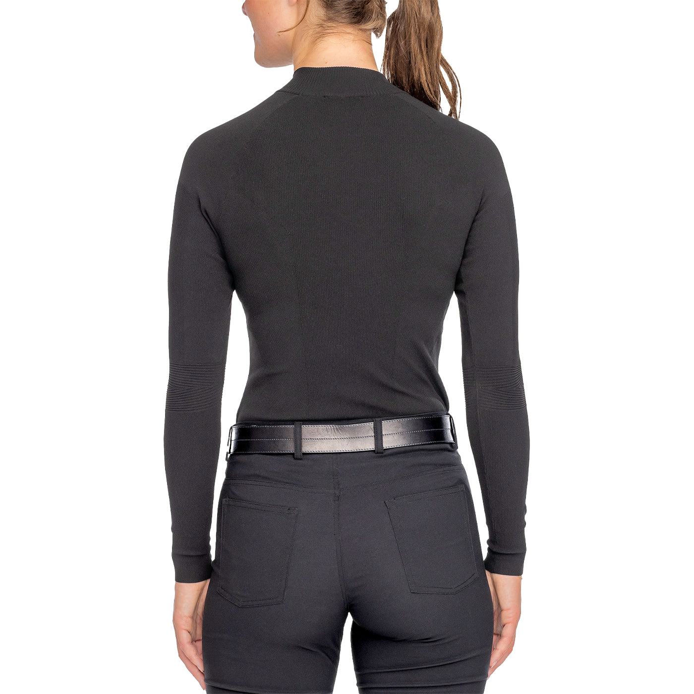 This modern technical knit sweater with crystal quarter zip is elevated without compromising comfort. Made from a super stretchy, subtle pattern knit fabric with a clear crystal 9 in. zipper. This sweater is this season's must have!