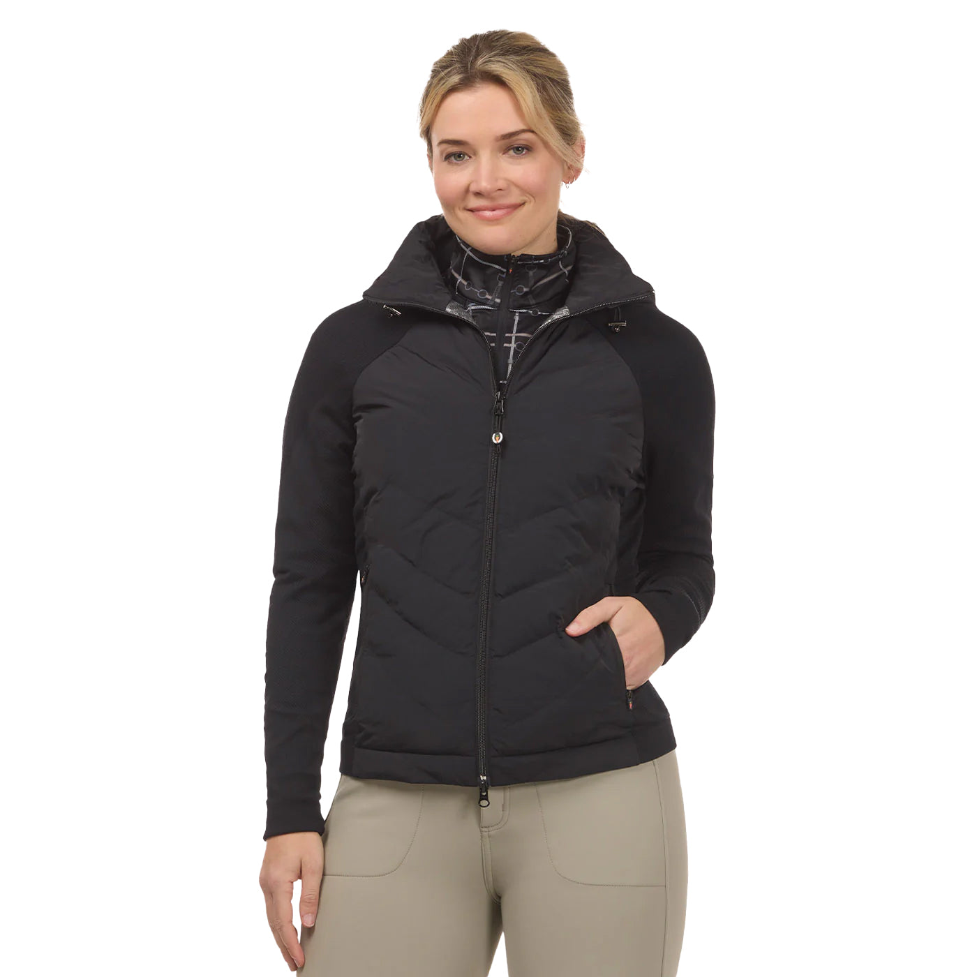 A flattering, quilted equestrian jacket designed to keep you warm and move with you in the saddle. The hybrid design combines high-tech core insulation with seamless, stretch-knit construction, while a thermal-reflective lining warms your core by retaining body heat. Slimming, dynamic seams and a feminine silhouette make it a stylish choice for both indoor and outdoor wear. Raglan sleeves enhance mobility and feature a snaffle bit design that adds a smart equestrian touch. An insulated removable hood keeps your head warm post-ride, ensuring comfort even when the temperature drops.