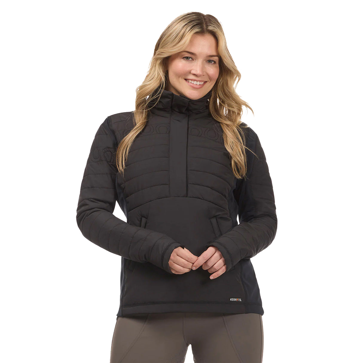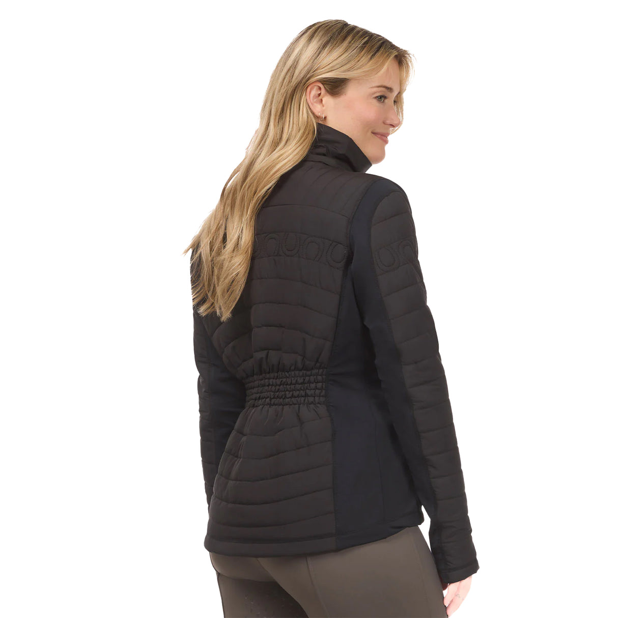 Perfect for a day with horses, this versatile, quilted pullover combines equestrian style, comfort and performance. The tall, softly-lined collar, extended half zip, and lightweight, poly-loft fill are designed to actively regulate core warmth, while thoughtfully placed stretch side panels provide freedom of movement. With distinctive embroidered horseshoes and a flattering cinched elastic back waist, this jacket captures the spirit of equestrian life.
