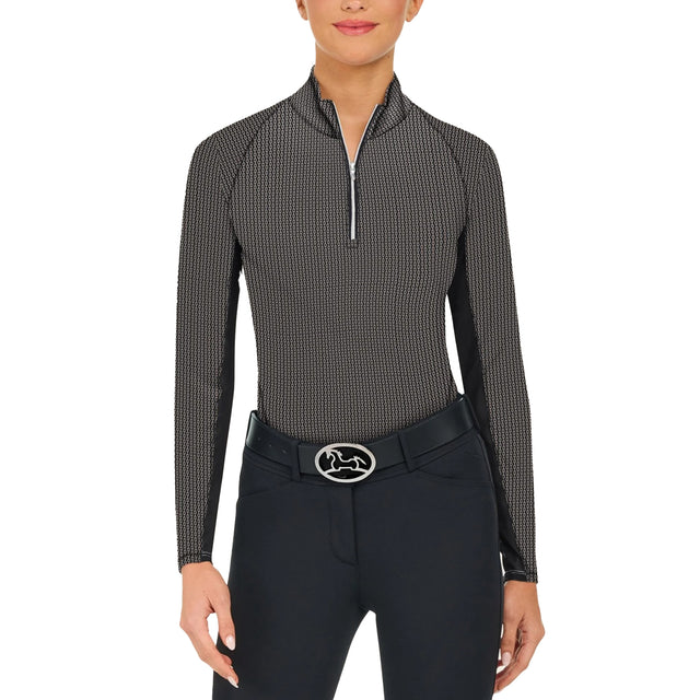 The Libby schooling shirt is a long sleeve, ¼ zip style featuring RJ Classics' silky, cooling fabric. Classic seam lines and a subtle microprint add dimension and color to your schooling outfits without compromising sun protection.