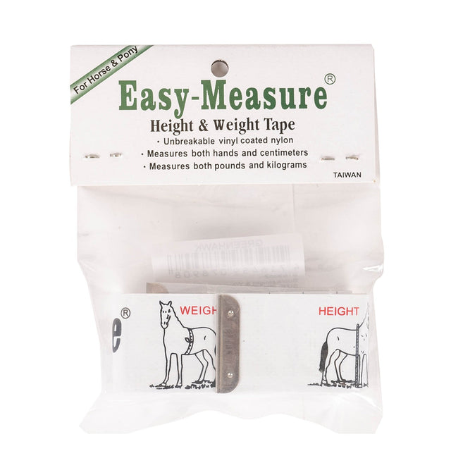 Measure your horse's height and weight in one handy, small measuring tape. This portable, packable measuring tape features horse height on one side and horse weight on the other. Height is shown in both centimeters and hands, while weight is shown in both pounds and kilograms. Includes visual images of where to measure for accurate readings. The small size makes this perfect for use when horse shopping or traveling. Handy for tracking the growth and development of young horses, or for tracking weight loss in easy keepers. Made from extra durable, vinyl coated nylon.