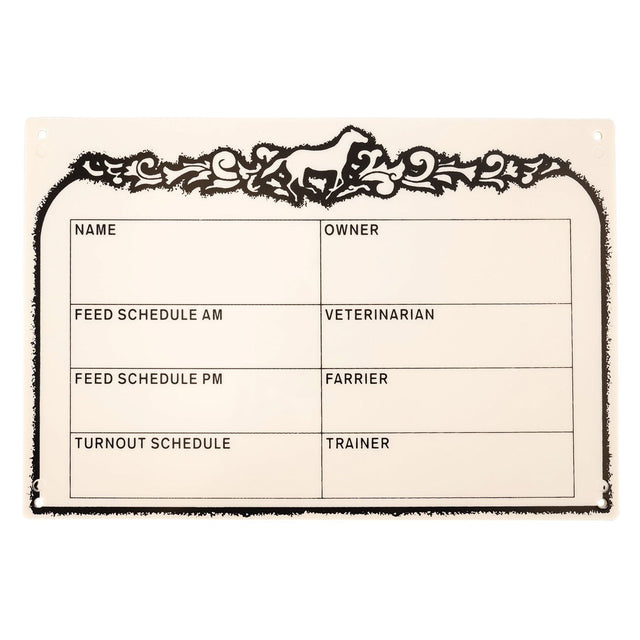 The Supra Stall Plate is the perfect solution to ensure horses receive individualized care. Call out important information about your horse with this plastic stall sign. Includes fields for your horse's name, owner information, AM and PM feeding details, turnout schedule, veterinarian, trainer and farrier information. This reusable stall sign is compatible with dry erase markers and easily wipes clean when information changes. Includes predrilled holes for easy installation. Mounting hardware not included.