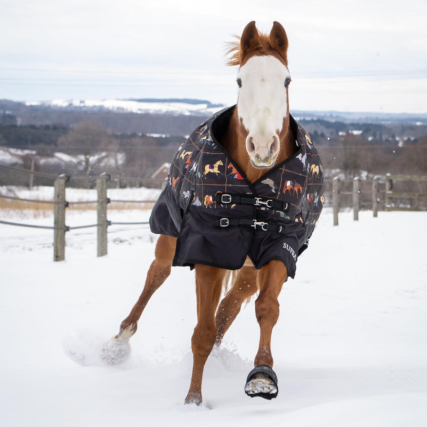 The Supra Turnout helps to keep your horse warm and comfortable during cooler weather. Features a waterproof 600 denier outer shell with a breathable 210 denier nylon lining that helps polish the coat with 300 grams of poly fill for added warmth. The shoulder gussets on each side provide an enhanced fit with no back seam. Complete with double front buckles and cross-biased surcingles help keep the blanket in place, adjustable back leg straps and reinforced stitching at all stress points.