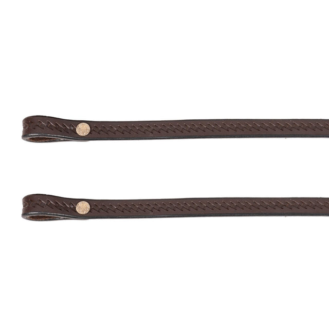 Classically designed split reins feature timeless basket weave tooling for added flair suitable in every discipline. Complete with sturdy hardware and Chicago screw closures for the bit. 5/8 in. wide, 7 ft. long.