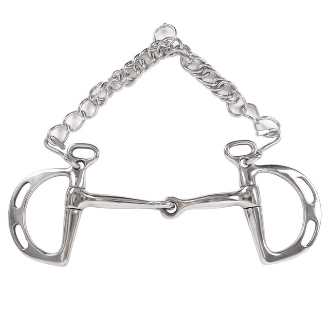 The EvoEq Single Jointed Kimberwick Bit offers a stainless steel, lightweight, and slotted kimberwick bit. The mouth of the bit is jointed with a curb chain and hooks for added leverage. Suitable for intermediate horses.
