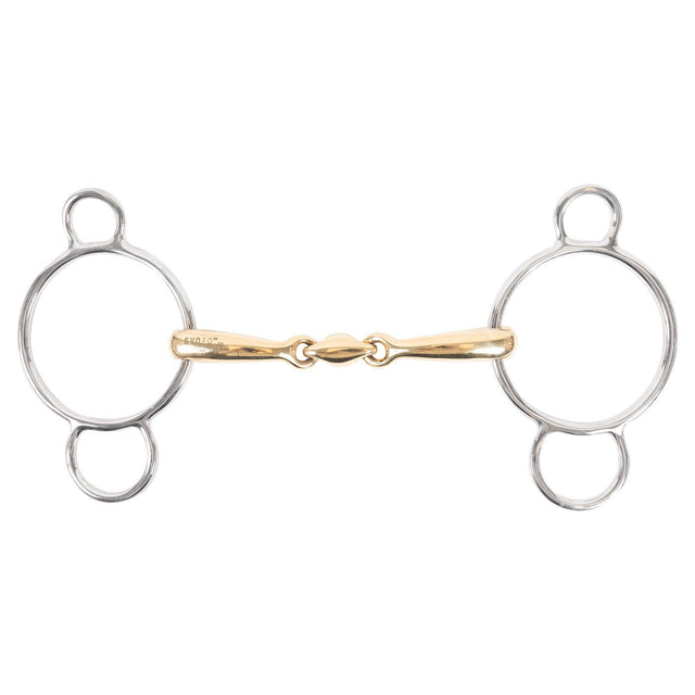 The EvoEq Universal Curved Mouth Double Jointed Bit W/ Lozenge is a two-ring snaffle bit. This bit features a double jointed, copper alloy mouthpiece with a center lozenge and stainless steel cheeks. The curved mouthpiece creates tongue relief.