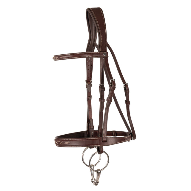 The Mondega Gayo Classic Hunter Bridle is exceptionally constructed from the finest French leather to be suitable for the show ring. Features fancy stitching on the noseband and browband. The wide, anatomically shaped, padded crownpiece ensures enhanced pressure distribution. Complete with a padded flap under the buckle of the noseband for superior comfort. Reins sold separately. Bit not included.