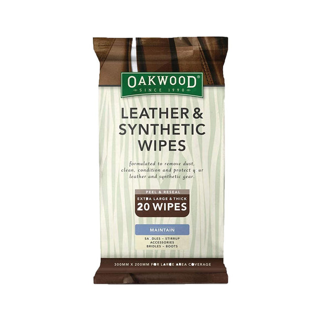 Oakwood Everyday Leather & Synthetic Wipes gently remove dust, dirt and grime from leather and synthetic surfaces. The unique leather & synthetic formulation moisturizes your leather articles to maintain softness and shine and shield from color fading and deterioration associated with everyday use and wear. Crafted with carnauba wax to restore, protect and buff to a lustrous finish in one simple process. Ideal for use on saddles, stirrups, bridles, head collars, chaps, boots, gloves, footwear and more. Extra-large and extra thick to cover more area.