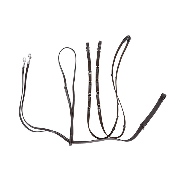 The Val du Bois German Martingale helps to teach the horse to give to the bit, flex at the poll, and maintain proper head position. Features a combination of a flat martingale with extended fork ends and webbed reins with 4 "D" rings. Complete with snap ends on the martingale for easy attachment. Average horse size.