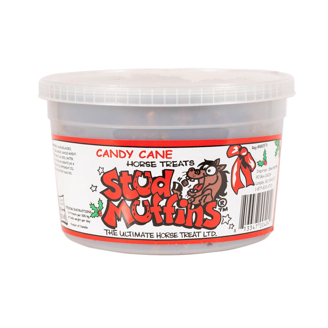 Stud Muffins are 100% hand-made horse treats that are crafted with care and devotion. Each treat contains grains such as wheat, oats, barley, and corn, and is fortified with flaxseed and other wholesome ingredients. Stud Muffins are as healthy as they are enjoyable! Packaged in a convenient and releasable tub with a candy cane flavor, perfect for the holidays.