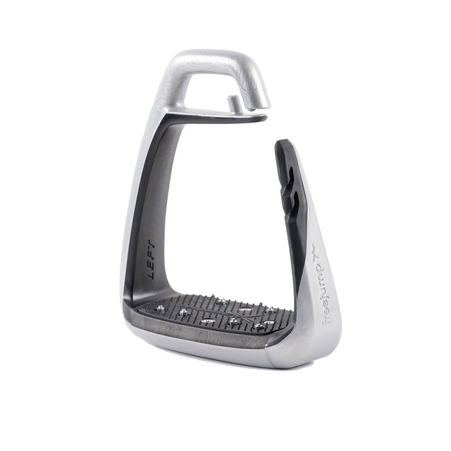 The Freejump Soft'Up Classic Stirrups are specifically designed for women with the comfort and technology of single-branch stirrups combined with an eye set parallel to the tread. Features improved shock absorption to help reduce the strain on each stirrup by two-thirds, offering 3 times more cushioning than a traditional stirrup with a center of gravity that is set towards the front to encourage the rider to keep their heels down. Complete with a flexible outer branch designed to make it easier to release the foot in the event of a fall,9 treated studs, and an extra-wide carbon tread.