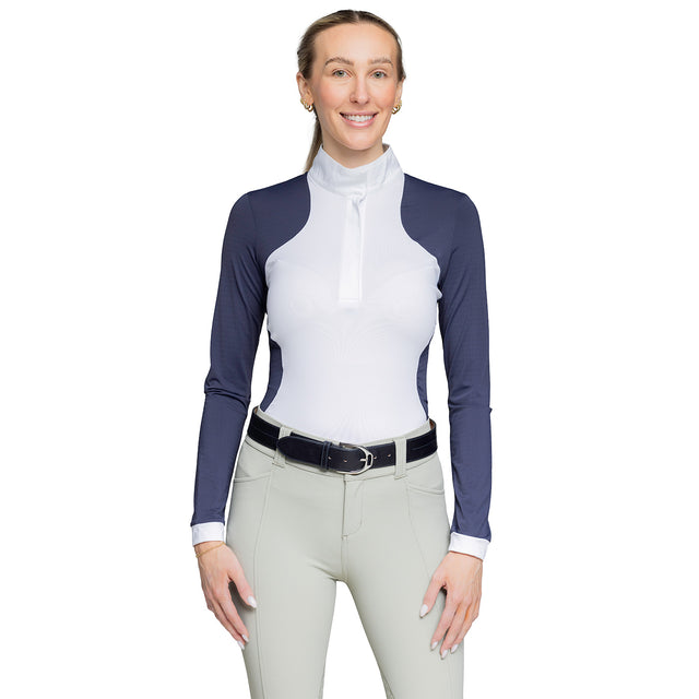 Get ready for compliments! The Kastel Bicolor Show Shirt has sporty curved accents that make it very flattering and comfortable. This show shirt features a quarter zip neckline closure with two snaps, and navy textured and perforated sleeves and side panels. Finished with a UPF 50 bodice, and soft 4-way stretch fabric in a contemporary fit.