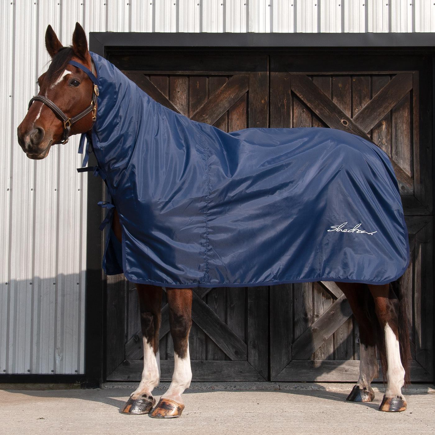 Perfect while ring or trackside, the Shedrow Ringside Rainsheet provides a breathable yet waterproof cover to your horse, tack and equipment. High neck construction shields more of your horse from rain than a typical rain sheet. Nylon tie closures enable this sheet to be easily taken on and off, while the unique design may also be folded back to offer a square cooler effect. Not suitable for unattended use.