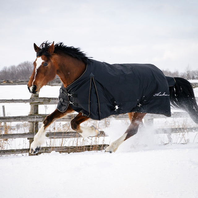 The Shedrow Turnout is the ideal everyday winter blanket. A waterproof yet breathable 1200 denier Ripstop shell is covered in a Teflon DuPont coating and lined with 210 denier nylon, offering both durability and comfort. A 300 g high grade poly fill keeps your horse warm and cozy while the deep shoulder gussets offer maximum freedom of movement. The cross-biased surcingles with rubber donuts feature stretchy elastic inserts for additional comfort and reinforced back up stitching for extra support. Two adjustable doubled-nylon front straps with quick release snaps help create a customized fit. Stretchy deluxe back leg straps help keep the blanket in place during all kinds of play. Overall double-stitched binding and reinforced stitching at all stress points help the Shedrow Turnout withstand all kinds of weather and wear. Complete with a reinforced tail cover.